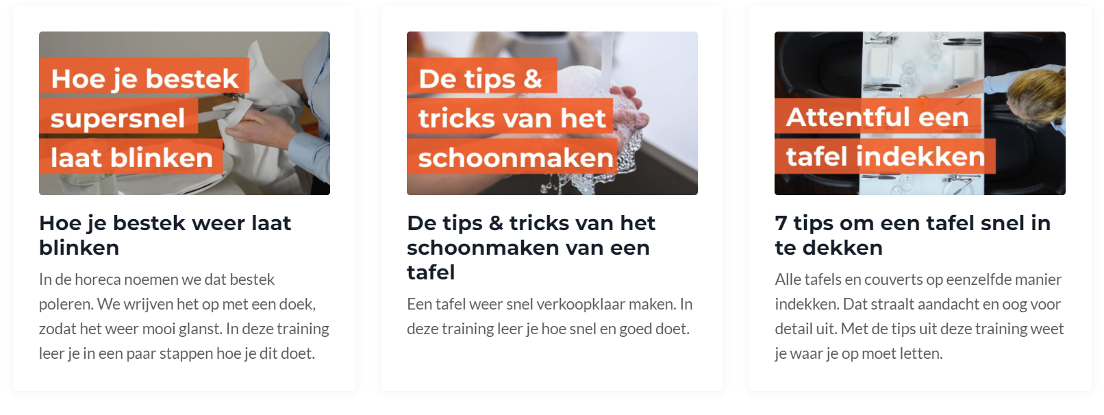 De inwerkmodules zijn de warming-up voor iedere horecamedewerker. In korte video’s behandelen we alle tips en tricks die je nodig hebt om goed te starten. Wij laten nieuwelingen merken dat zij over enorme talenten beschikken.